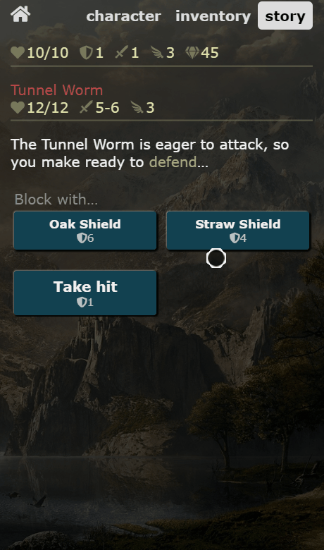 During defense, you can pick a weapon to block (shields or swords), or choose to take the hit. In this case you trust on your armor and save your weapons from wearing down. If your speed stat is high enough, there is also the chance that you dodge the attack entirely!